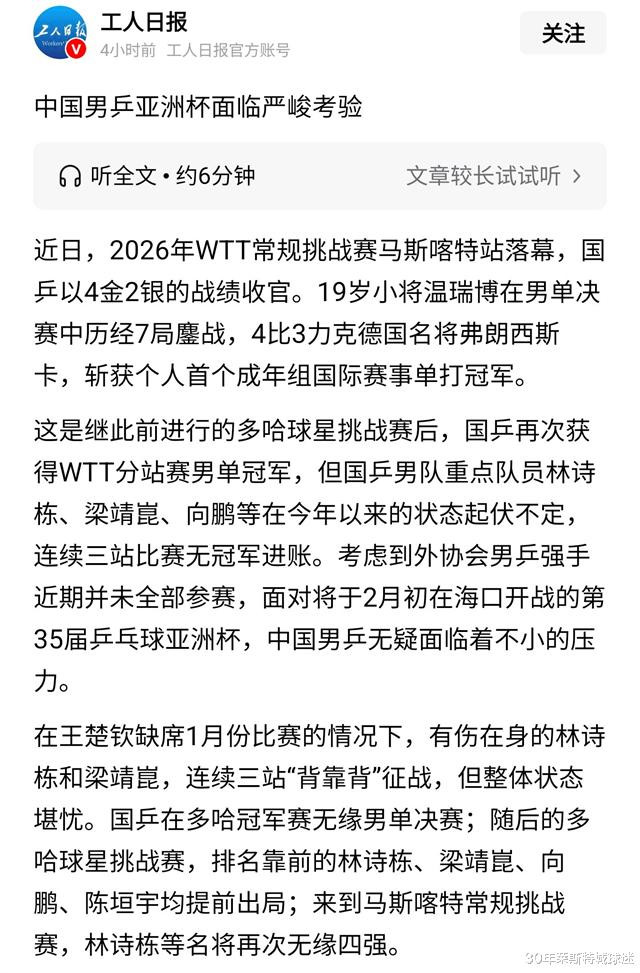 看得出,国乒主力频繁输球的前提,还是外协会并没有派出全部主力选手,这就尴尬了,如此情况都无法拿到冠军,足以看出国乒状态有多差。梁靖崑和林诗栋连续作战身体欠佳,该文章作者仍强调“但整体状态堪忧”,足以说明问题严重性。